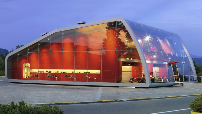 Exquisite design for this factory shopThis famous brand used glass to great effect on this simple factory shop with a difference.